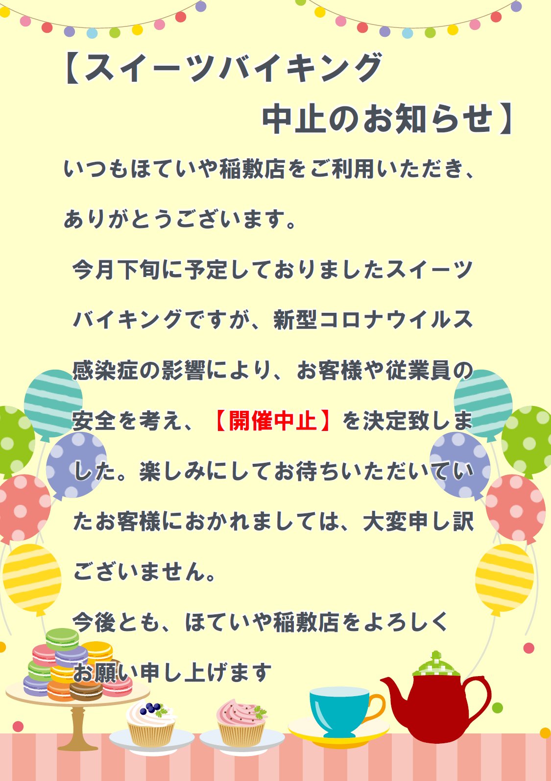 佐原ばやし本舗ほていや 稲敷店スイーツバイキング中止のお知らせ 7月下旬に予定しておりました 稲敷店限定スイーツバイキング ですが 新型コロナウイルス感染症の影響により 開催中止 を決定しました また安心してスイーツバイキングを楽しん